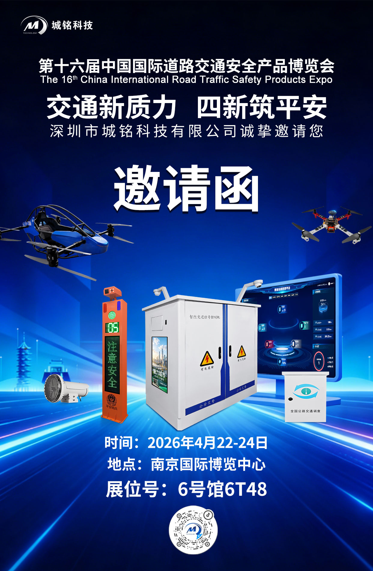 2026 年 4 月 22-24 日,第十六届中国国际道路交通安全产品博览会(南京交博会)将在南京国际博览中心举办。深圳市城铭科技有限公司携智能交通全系列产品重磅亮相,以创新技术赋能智慧交管与道路安全,诚邀各位莅临参观交流。
