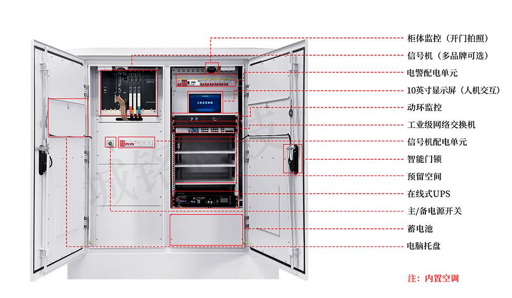 机柜由柜体、动环监控、在线式UPS+电池组、配电单元、机柜照明、通风系统、恒温空调等配套设备组成;整机隔热防水防尘,循环风道、精密空调提供恒温保障,为监控摄像机、传输设备、交通信号机、交通信号灯、雷视一体机、监控补光灯等设备的正常运行及智能运维管理提供有力保障。